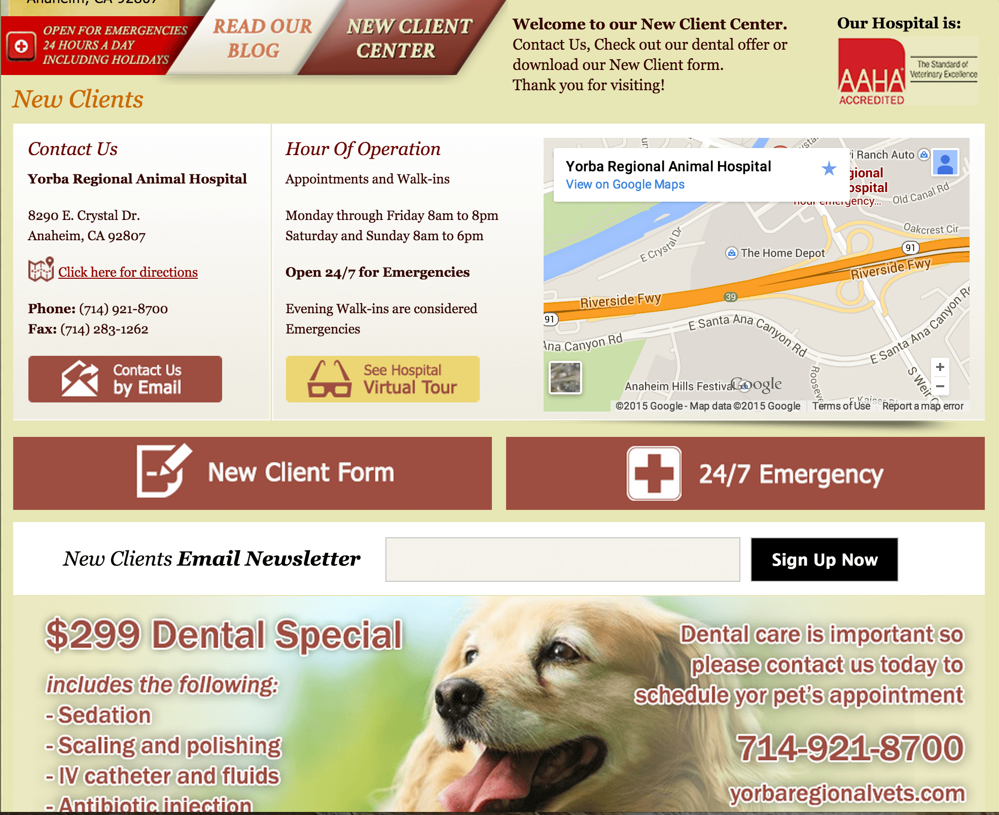 There are even more features, like a virtual tour, new client forms, AAHA-Accredited symbol, maps, emergency care info, newsletter sign ups, as well as testimonials. Click here to view a real version of our New Client Center.